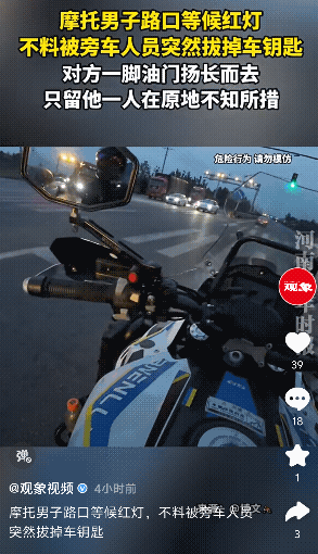 话说,小轿车人员拔走摩托车车钥匙的时候,车主应该是有看到吧,为啥不反抗呀!还是说没反应过来呢?还是觉得这个人身上有纹身不好惹呢?真是奇怪了!