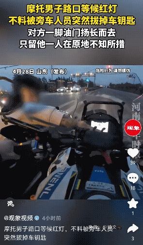 山东,一男子骑摩托车在路口等红绿灯时,没想到,被旁边的小轿车人员从车窗里拔走了钥匙,绿灯时,小轿车一脚油门走了,男子呆在原地,不知所措!