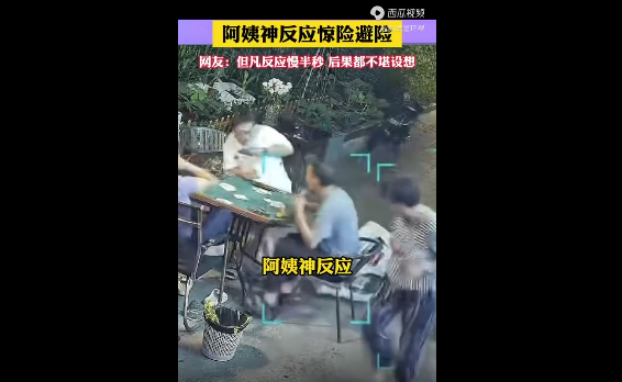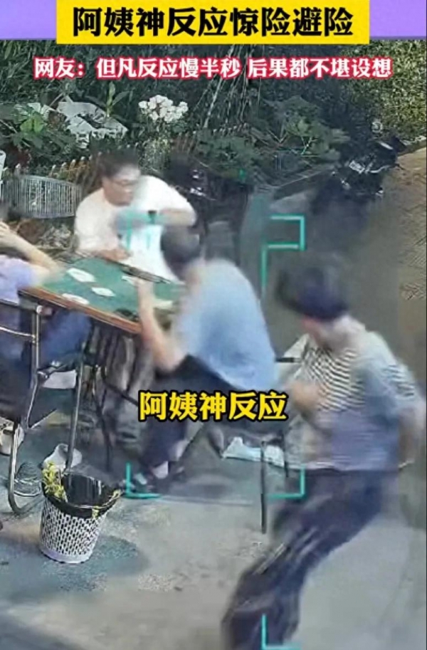 4月14日广东东莞某小区现惊险一幕:4人在楼下打牌,一名阿姨站着围观,多人听见异响突然抬头,围观阿姨没有抬头立即跳开,瞬间一台空调外机砸落在阿姨脚边,5人赶紧跑开。