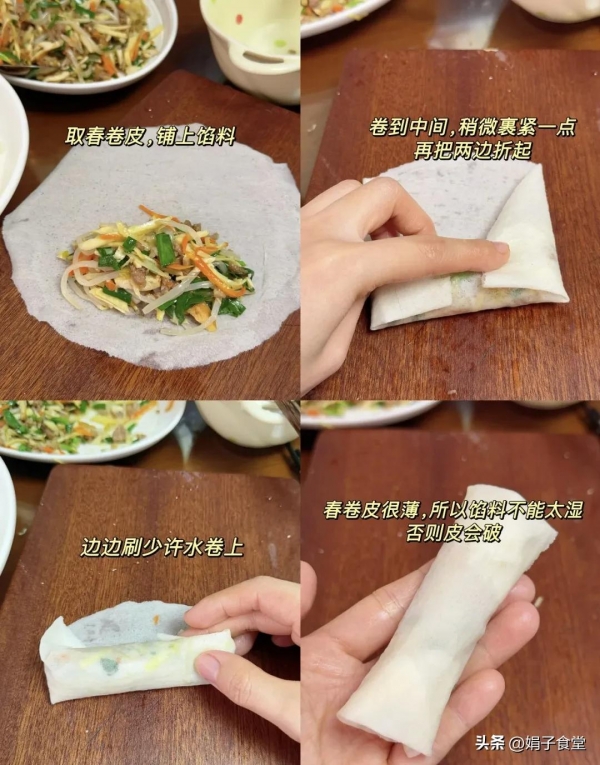 3、取一张春卷皮,放上炒好的馅料,给它包紧实。全程中小火炸,炸至表皮金黄酥脆就可以出锅了。