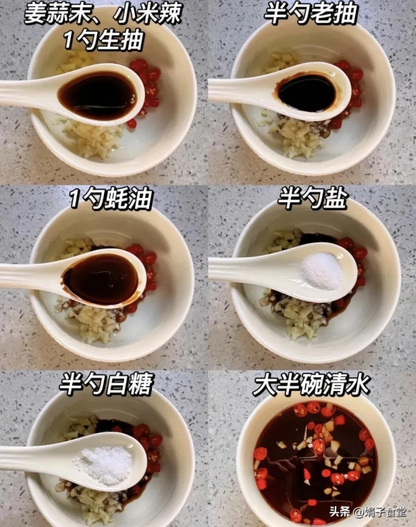 1、先调好料汁,待会做菜的时候不会手忙脚乱。碗中加入适量姜末、蒜末、小米辣,再加1勺生抽、半勺老抽、1勺蚝油、半勺食盐、半勺白糖,加大半碗清水搅匀化开备用。