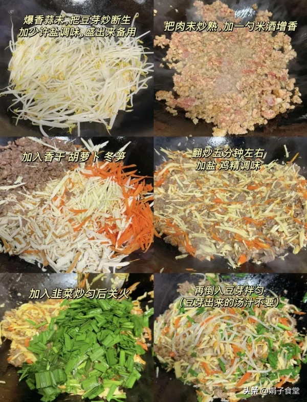2、锅中油热后倒入肉末炒熟,加1勺米酒增香,然后放入香干、胡萝卜和冬笋,翻炒5分钟左右,加适量盐和鸡精调味,放入韭菜段炒熟后关火,再倒入炒熟的绿豆芽,翻拌均匀就可以了。
