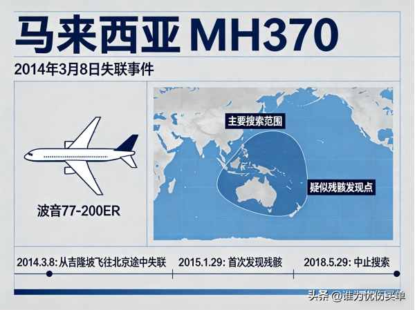 根据2026年3月8日报道,在马来西亚航空公司MH370航班失联12周年的特殊日子,马来西亚交通部发布官方通报,披露了与水下探测公司"海洋无限"合作开展的最新一轮海底搜寻结果:截至2026年1月23日结束的当前阶段搜寻,未发现任何可确认飞机残骸位置的线索 。