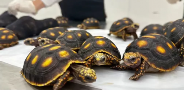 一名旅客穿着两层紧身裤,在紧身裤夹层内用黑色丝袜紧缠的活体龟共30只。后经广东鹏海司法鉴定所鉴定,该批活体龟为爬行纲龟鳖目陆龟科南美陆龟属红腿陆龟或黄腿陆龟,被列入《濒危野生动植物种国际贸易公约》。