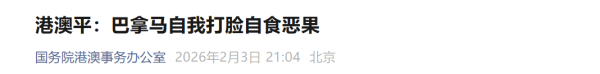 3日晚,微信公众号"国务院港澳事务办公室"发布文章《港澳平:巴拿马自我打脸自食恶果》,全文如下: