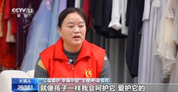 "公益婚纱 幸福小站"主理人 梁雪芳:其实每一件婚纱我都非常有感情,就像孩子一样,我会呵护它、爱护它。我就生怕哪里弄坏了,下一个人就不能借了。