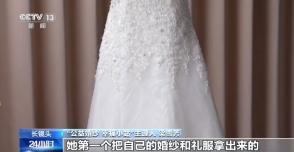 "公益婚纱 幸福小站"主理人 梁雪芳:我儿媳妇第一个把自己的婚纱和礼服拿出来,然后我在朋友圈里发了以后,有好多小姐妹家里也有婚纱,就这样陆陆续续来了。