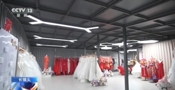 直播间里,主理人梁雪芳热情地展示着满屋的婚纱。小站里,主纱、礼服、秀禾服分区悬挂,各种款式琳琅满目,全都免费出借。
