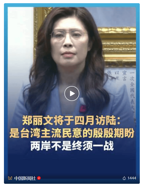 据中国新闻网,中国国民党主席郑丽文谈将于4月访陆:这是台湾主流民意的殷殷期盼,两岸不是终须一战,希望本次访问为两岸开启和煦温暖的春天。