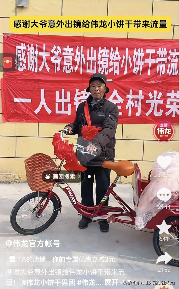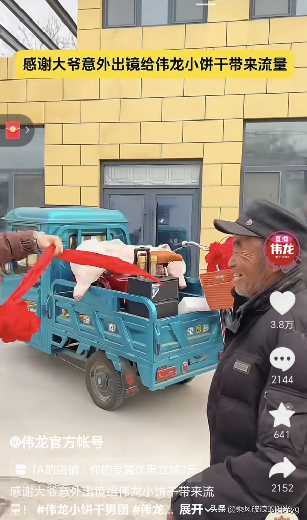 2月5日,卫龙工作人员带着全新电动三轮车、半扇鲜猪肉以及满满一车品牌小饼干,找到出镜大爷并完成交付。现场为大爷佩戴大红花、拉起致谢横幅,大爷喜笑颜开,连称"没想到路过一趟还能收获这么大惊喜"。这份接地气的回馈迅速引发热议,网友点赞"实在又暖心,把流量变成了人情味"。