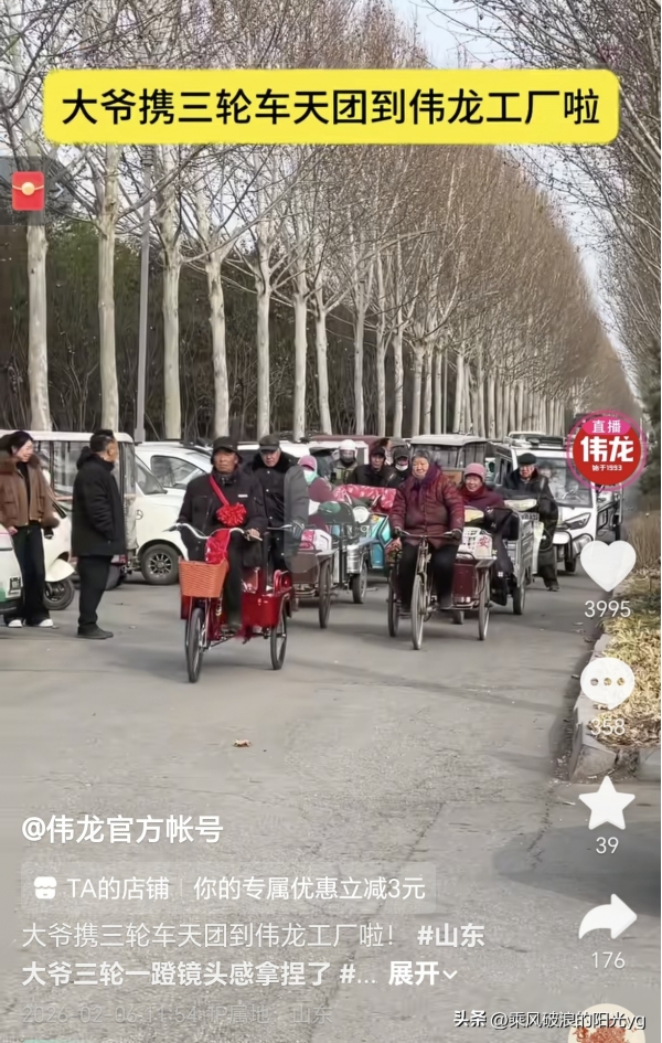 事件迎来更欢乐的后续:收到厚礼的大爷心怀感激,次日邀约同村数十位老人,组成"老年三轮车车队"浩浩荡荡前往卫龙小饼干工厂回访。老人们骑着各色三轮车有序列队,车上载着邻里的谢意与笑容,厂区门口再度成为欢乐现场。卫龙团队热情接待,为老人们送上零食礼包,双方互动温馨融洽,定格成充满乡土温情的画面。