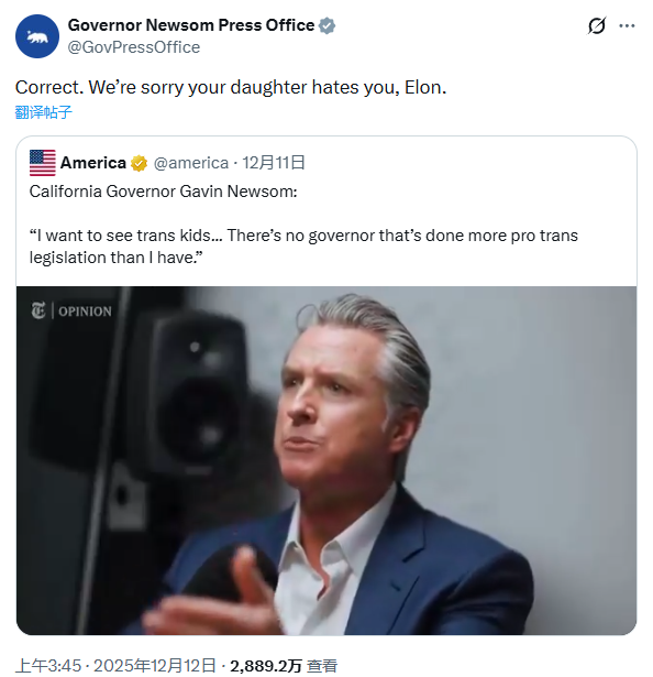 当地时间12月11日,马斯克旗下"美国政治行动委员会"发布一则视频,纽森在视频中表示,他希望看到跨性别儿童,且没有哪位州长比他制定了更多支持跨性别者的立法。纽森办公室12日转发该视频并写道:"没错,很遗憾你女儿恨你,埃隆。"