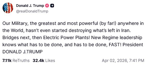 特朗普说到做到。4月2日晚7时40分,特朗普在他的"真相"社交媒体上发帖称,"美军是世界上最棒的,它即将以风卷残云之势,轰炸伊朗的桥梁,电站!伊朗的新政权应有自知之明。赶快行动吧!"