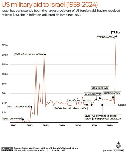 美以对伊朗开战以来,英语空间中(English Sphere)多有特朗普本人极其家族与犹太院外游说集团、以色列总理内塔亚胡"共谋"的论点。然而美以"合谋"非一日之交,半个世纪以来美国历届政府都对以色列拔刀相助,以海量的军援支持以色列对邻国的扩张和侵略行径,直接间接导致了中东持久的战乱。