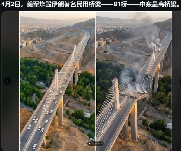 几乎在特朗普发帖的同时,美军着手摧毁了伊朗的三座大桥,包括刚刚竣工的连接首都德黑兰和伊朗第二大城市卡拉季的B1大桥。这座全长1050米的混凝土箱梁斜拉索桥,是中东最高的桥梁,还未正式通车便毁于美军的精密制导弹药。