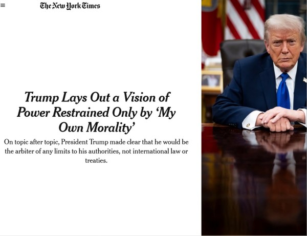 然而对于我行我素、笃信"美国第一"的特朗普来说,任何国际法都不具有约束力,正如他年初对《纽约时报》所说:"我不需要国际法";如果这个世界对他有任何 "限制"的话,"只有一件事。那就是我自己的道德标准和意志。这是唯一能阻止我的东西。"