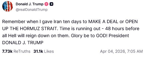 美国总统特朗普4月4日发帖,再次提醒伊朗在48小时内开通霍尔木兹海峡,否则将遭受灭顶之灾。