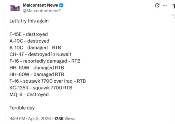 4月3日美军机战损统计。 RTB=damaged but able to return to base (受伤但得以返回基地)。