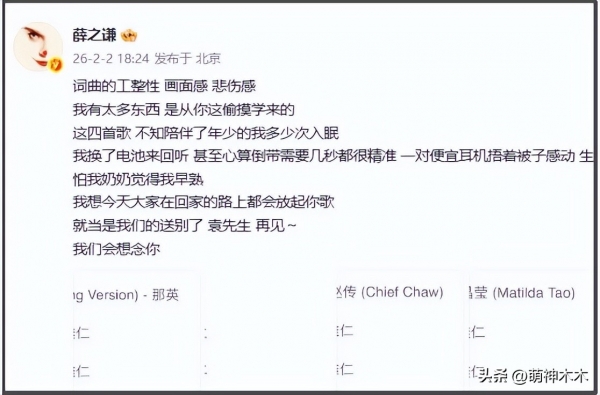 薛之谦晒出袁惟仁四首代表作表达自己的喜爱之情,称它们陪伴了自己的少年时光,而自己则从袁惟仁那偷摸学到了很多,比如词曲工整、画面感等,而他的送别方式就是回家的时候再次播放袁惟仁的歌,并表示会永远想念他。