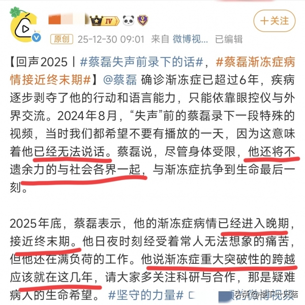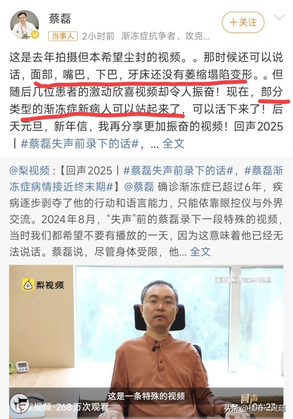 蔡磊也在社交平台转发了该视频,并写道这是去年拍摄的视频,那个时候他还可以说话,现在的蔡磊已经无法说话,面部嘴巴下巴和牙床已经萎缩塌陷变形。他的渐冻症病情已经接近终末期,但是已经有部分类型的渐冻症患者可以站起来了!