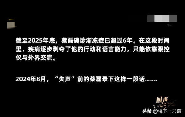 视频里的蔡磊虽然能够说话,但是说话时嘴巴嗓子等很是受限,他说的每一句话都需要付出巨大努力,但他依旧在为屏幕前的各位病友们加油打气。
