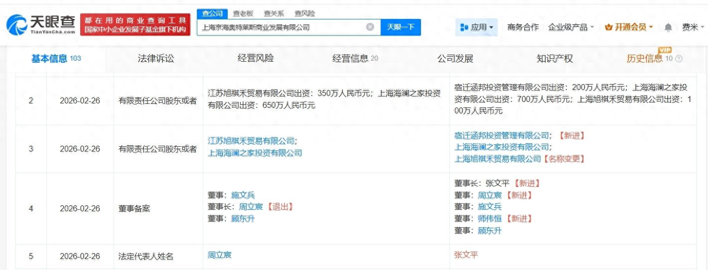 电商巨头与实体龙头再掀资本联姻!3月5日,上海京海奥特莱斯商业发展有限公司完成重磅工商变更,京东旗下宿迁涵邦投资持股20% 战略入局,海澜之家持股70%,京东系张文平接任法定代表人,原海澜集团董事长周立宸卸任。