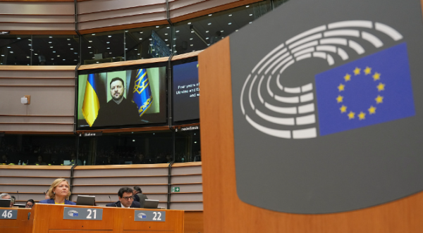 2月24日,比利时布鲁塞尔,泽连斯基就俄乌冲突四周年在欧洲议会发表视频讲话。视觉中国