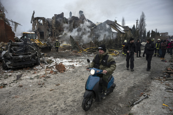 当地时间2026年2月22日,乌克兰基辅,一名当地居民骑着摩托车经过一处在大规模俄军袭击中受损的居民区。视觉中国