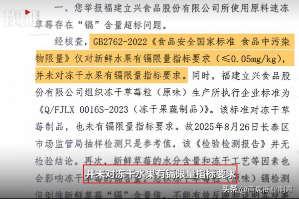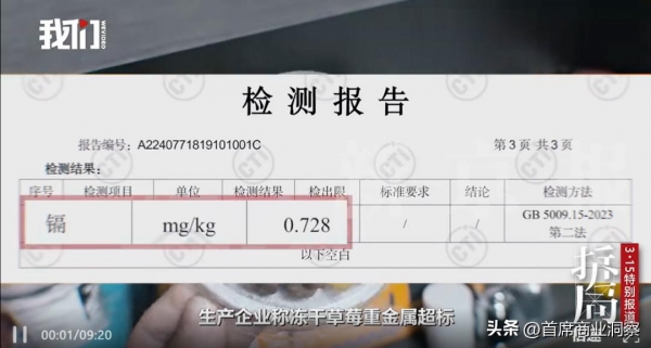 而实际上,林女士的冻干草莓中,草莓原料从生产商和果农那采购,检测却发现镉含量已经达到了0.728毫克每公斤,足足超标了14.56倍。
