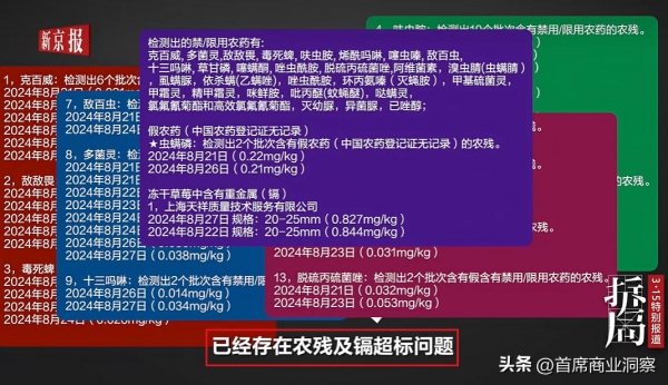 记者深度调查暗访发现,事情起因是福建泰湖谷场食品公司负责人林女士采购的冻干草莓原料,加工生产成冻干草莓后,被送去质检后,发现含有重金属镉超标14倍多,更检出含有20余种农残,也不乏一些被"限制使用"的高度农药。