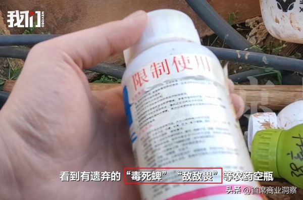 更扎心的是,记者实地走访发现,果农种植的草莓园里,各种农药瓶子一大堆,即便是"限制使用"的毒死蜱、敌敌畏等高度禁药也是随处可见。