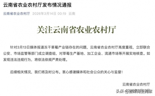 目前来看,随着媒体的陆续曝光和林女士的举报,云南省农业农村厅联合公安和市场监督成立三方调查组,对涉事的冻干草莓原料生产加工企业进行彻查。