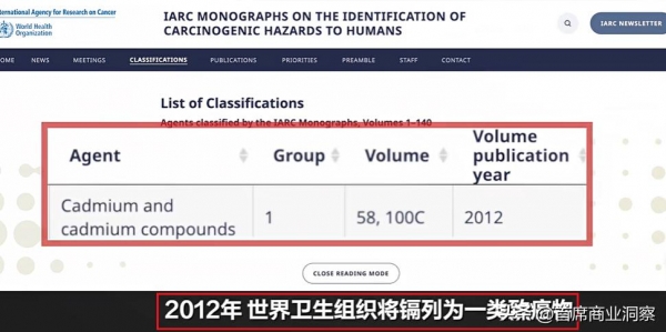 但镉含量超标却是实打实的食品安全重大问题,这个化学元素早在14年前就被世卫组织列为一类致癌物,是毒性很强的重金属。