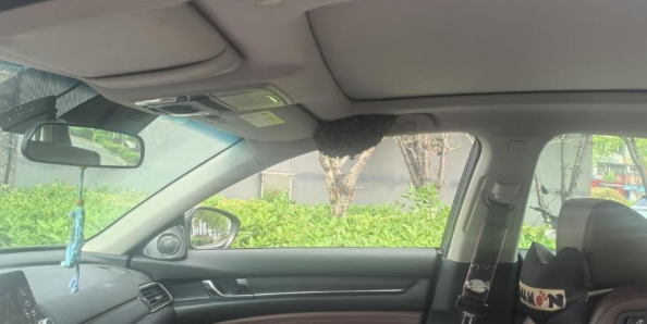 杭州汪先生最近真被吓懵了!就下车办事15分钟,副驾车窗没关严,回来一看整个人都傻了--车窗边围满蜜蜂,副驾靠背居然已经筑好一个拳头大的蜂巢,嗡嗡声听得人头皮发麻 。