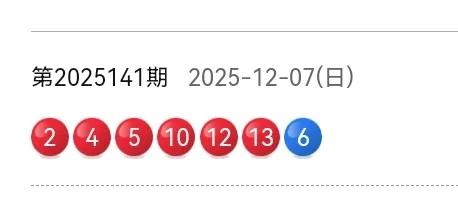 开奖号码是:红色球2、4、5、10、12、13,蓝色球6