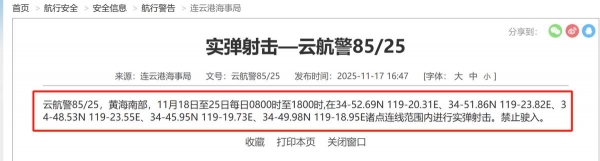 根据连云港海事局发布的最新航行警告显示,中国海军将在黄海南部的部分海域进行长达数日的实弹射击演习。演习将从本月18日持续至25日,共8天;每天演习时间为早8时至下午6时,每天10小时,规模和强度可见一斑。