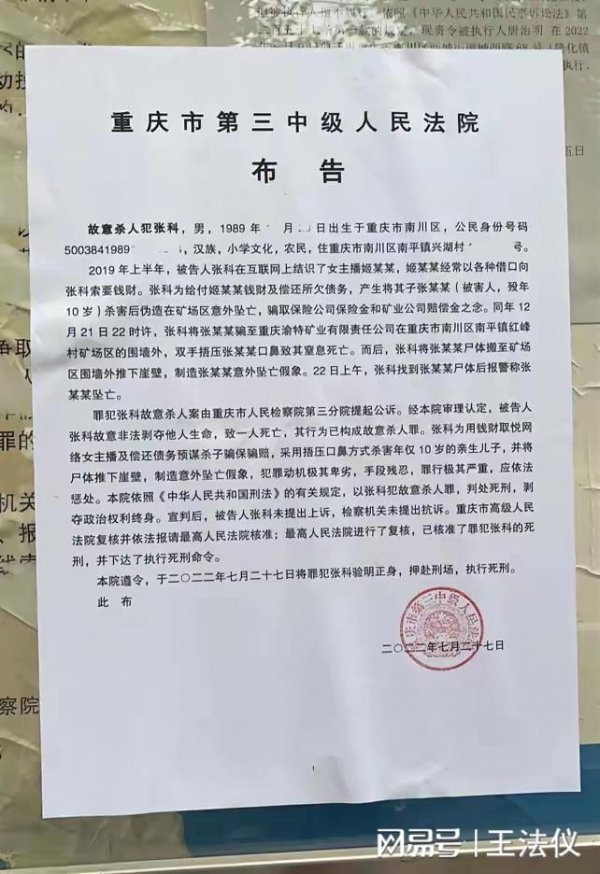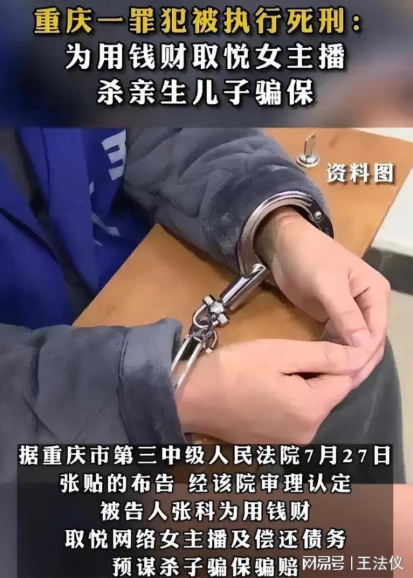 "丧心病狂",重庆男子张某在网上认识美女主播姬某,张某为了取悦姬某,主动帮她偿还债务,于是就将自己10岁的亲生儿子亲手捂死后,将尸体推下悬崖,制造儿子意外坠亡的假象,企图以此来高额保险。次日张某报警称儿子意外坠亡,最终警方查明是张某亲手杀害儿子,法院最终判处张某死刑,立即执行。(来源重庆二中院)