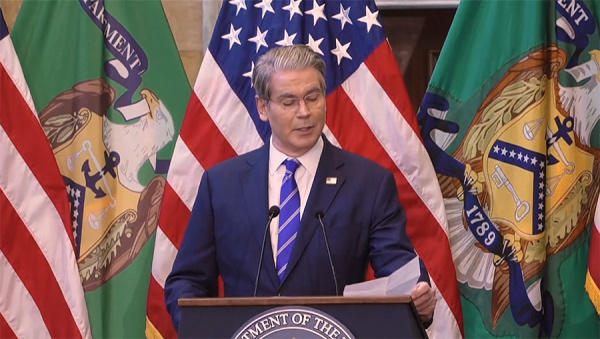 当地时间10月15日,美国财政部长贝森特召开新闻发布会。视频截图