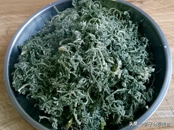 锅里加水烧开,把拌好面粉的茵陈放上去,大火蒸10分钟,中途可以翻拌一下,这样蒸得更均匀一些。蒸好后盛出来,淋上蒜泥、辣椒油或者自己爱吃的酱料,翻拌均匀就能吃了,清香软糯,带着野菜独有的鲜甜味,越吃越香。
