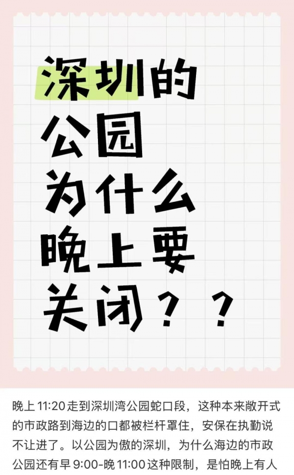 "深圳很多海滨公园晚上闭园太早,能否将封闭管理的公园等城市空间打开?"