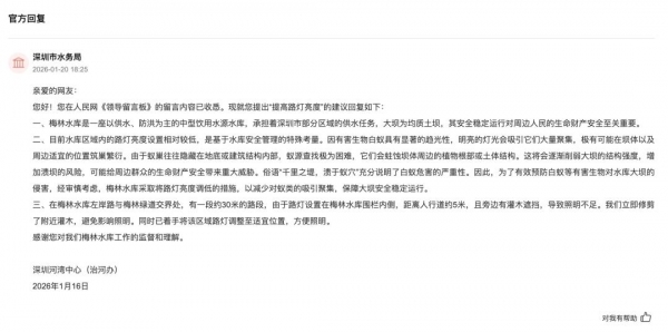对此,深圳市深圳河湾流域管理中心(深圳市治理深圳河办公室)回复称,目前水库区域内的路灯亮度设置相对较低,是基于水库安全管理的特殊考量。因有害生物白蚁具有显著的趋光性,明亮的灯光会吸引它们大量聚集,极有可能在坝体以及周边适宜的位置筑巢繁衍。为有效预防白蚁等有害生物对水库大坝的侵害,经审慎考虑,梅林水库采取将路灯亮度调低的措施,以减少对蚁类的吸引聚集,保障大坝安全稳定运行。