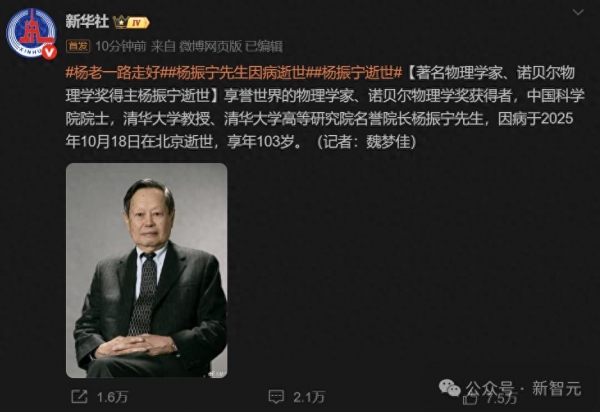 享誉世界的物理学家、诺贝尔物理学奖获得者,中国科学院院士,清华大学教授、清华大学高等研究院名誉院长杨振宁先生,因病于2025年10月18日在北京逝世,享年103岁。
