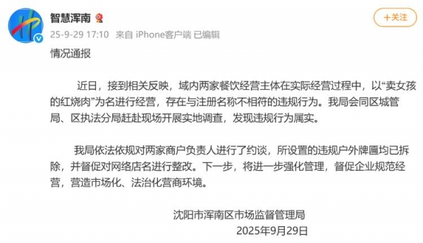 9月29日,浑南区市场监督管理局工作人员回复记者,"这个名字社会影响确实不太好,昨天接到反映后,我们督促餐馆负责人对牌匾处理整改,目前把店名从'卖女孩的红烧肉',改成了'卖红烧肉的女孩',几大外卖平台上也暂时下架了。"