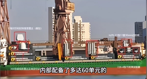 武器方面甲板上搭载了多组集装箱式垂直发射舱,按"3排16个"的布局排列,每个集装箱集成4个发射单元,仅公开配置就达48个。