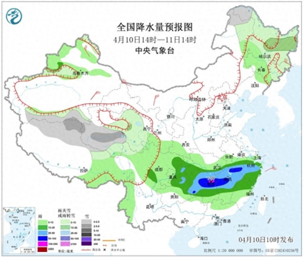 4月10日全国降水的核心区域将会略微南落,重庆、贵州、湖南到福建西北部这一带将普遍会出现大到暴雨,其中在湖南的中部局地还可能会下起大暴雨。下雨的同时不少地方往往会伴随着短时强降水,11级以上的雷暴大风、冰雹等强对流天气。