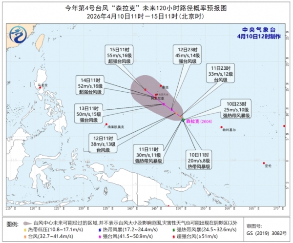 今年4号台风森拉克,于4月10日凌晨2时在西北太平洋上生成,目前为8级热带风暴级,旋转风速为20米每秒,中心气压为995帕,位置在距离美国关岛东南方向约840公里。
