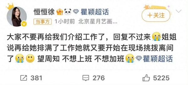 3月16日,瞿颖经纪人在社媒发文"别给我们介绍工作了,回复不过来。" 随后更是调侃:"再排满工作,她就又要开始在现场挑拨离间了。"最后还不忘补一刀:不想上班,不想加班。