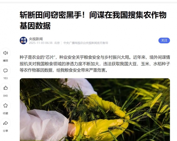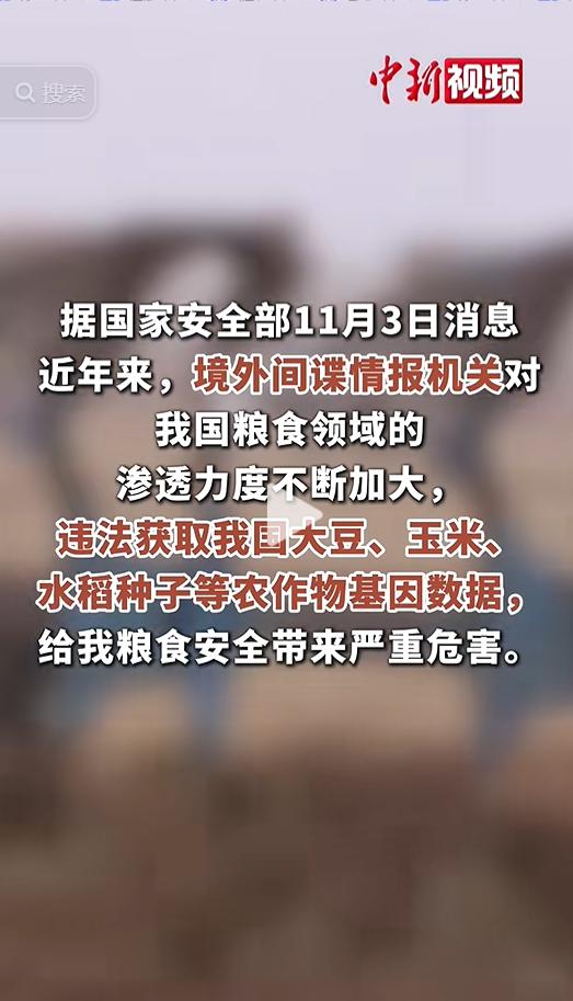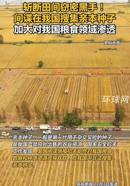 11月3日,央视新闻发布了一篇名为《斩断田间窃密黑手!间谍在我国搜集农作物基因数据》的文章,称国家安全机关工作发现,某国间谍情报机关在我国内非法搜集亲本种子。