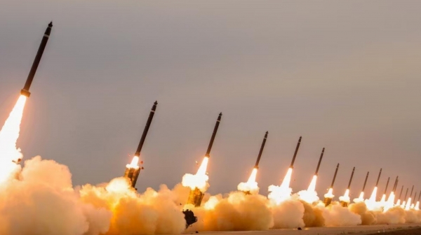 (朝鲜近期加强战备,增强了实弹训练强度,图为近期朝军齐射大口径火箭弹)
