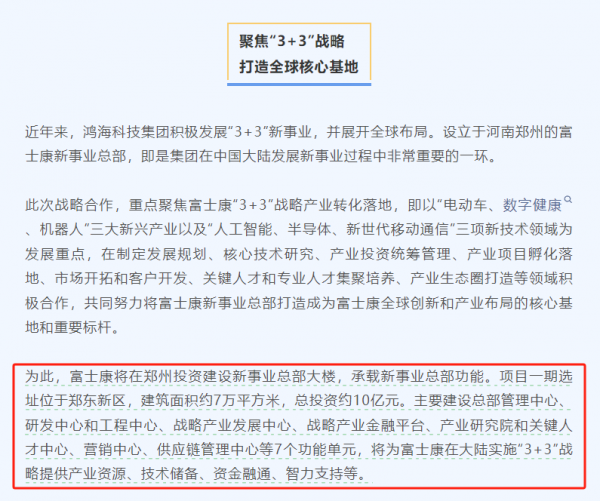 近日,富士康母公司鸿海发布公告,称将在河南郑州投资10亿,建设新的事业总部大楼,且还将布局电动汽车整车制造和电池项目。